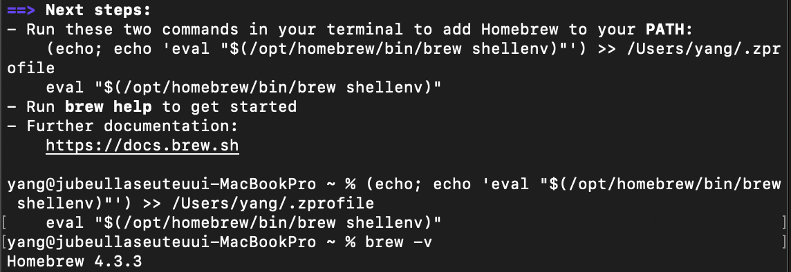 brew 설치후 아래 두개의 명령어를 실행시켜 환경변수 등록을 시켜줘야한다.