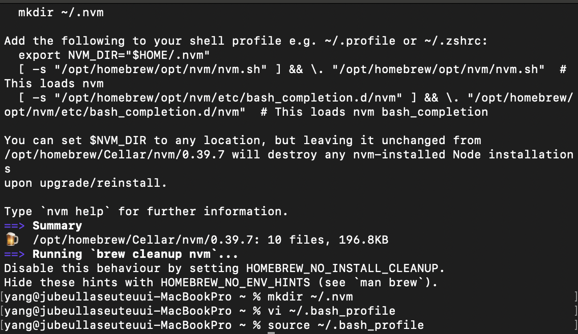 '~/.bash_profile'에서 복사한 내용이 '~/.zshrc'에 제대로 포함되었는지 확인한다. 예를 들어 'nvm' 관련 설정이 포함되어 있는지 확인 한다.
