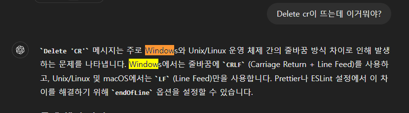 eslint에서 Delete `CR`이 나오는 문제해결(개인기록)