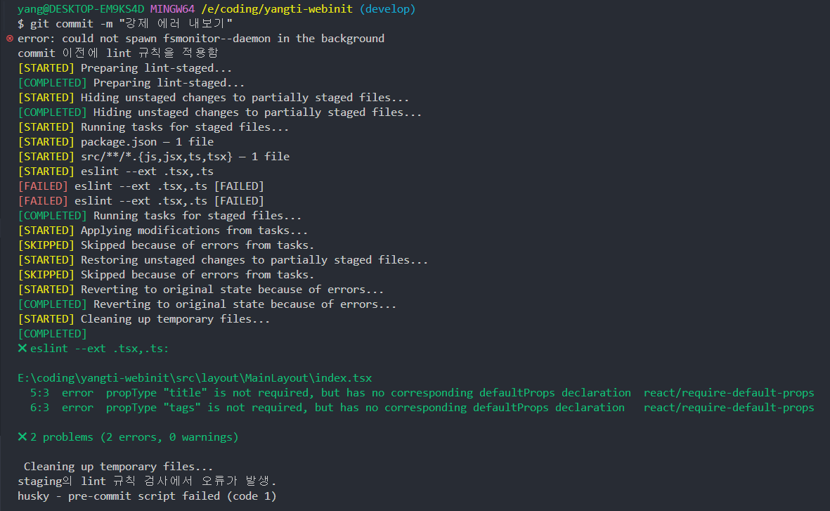 강제 에러 내보기로 commit 을 시도하자 당연하게도 실패하는 모습
