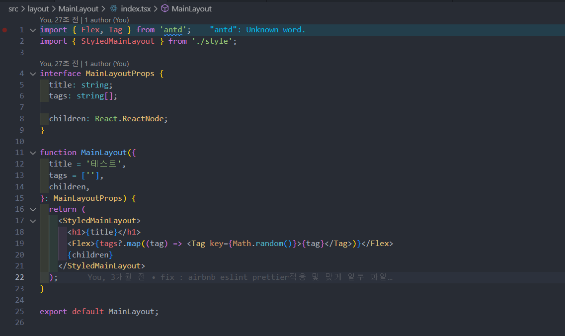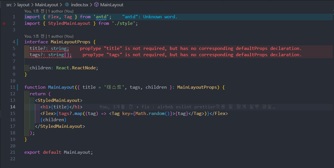 MainLayoutProps에 title과 tags에 에러를 주었다.