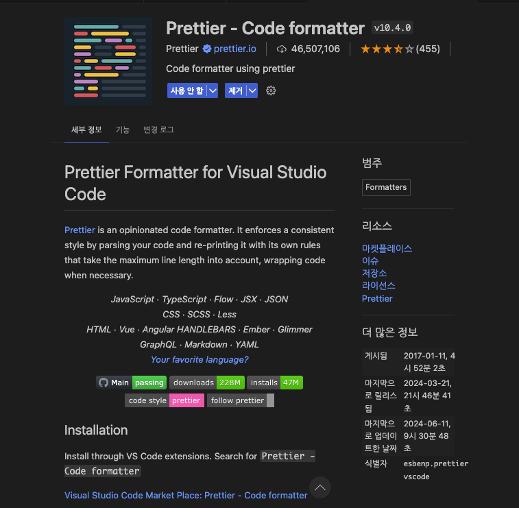 익스텐션 Prettier - Code formatter를 설치해준다.